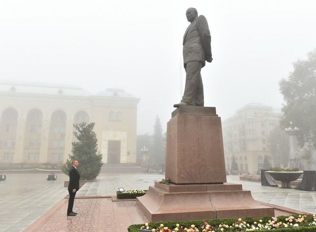 Mediatv.az Oxu.Az-a istinadən xəbər verir ki, əvvəlcə dövlət başçısı ulu öndər Heydər Əliyevin şəhərin mərkəzində ucaldılan abidəsini ziyarət edərək, önünə gül dəstəsi qoyub.