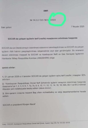 Xəbər verildiyi kimi, SOCAR prezidenti Rövşən Nəcəfin 7 noyabr 2025-ci il tarixli əmri ilə şirkət əməkdaşlarının maaşlarının 2026-cı ildən etibarən 30% artırılması barədə məlumat mətbuatda yayılıb."DİA-AZ" xəbər verir ki, sosial şəbəkələrdə sənədin fotosu paylaşıldıqdan sonra diqqət çəkən bir detal geniş müzakirələrə səbəb olub.