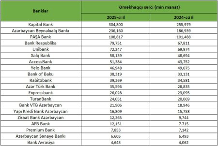 2025-ci ilin yekunlarına əsasən, Azərbaycanda fəaliyyət göstərən bankların əmək haqqı üzrə xərclərinin illik artım dinamikası açıqlanıb.2025-ci ilin IV rübündə “Kapital Bank” 304,8 milyon manatla müvafiq göstərici üzrə siyahıya başçılıq edib. İkinci yerdə 236,16 milyon manatla Azərbaycan Beynəlxalq Bankı, üçüncü yerdə isə 108,82 milyon manatla “PAŞA Bank” qərarlaşıb.