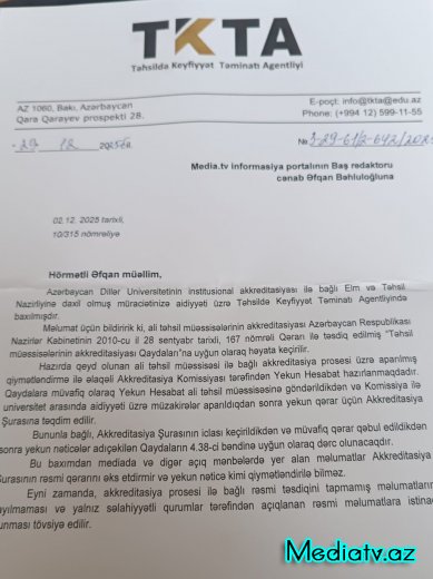 Bir müddət əvvəl Mediatv.az xəbər portalında "ADU akkreditasiyadan niyə keçə bilmədi -Kamal Abdulla üçün ciddi siqnal" sərlövhəli məqalə dərc olunmuşdu. Azərbaycan Dillər Universiteti ilə bağlı dərc olunan materialda ali təhsil müəssisəsinin akkreditasiya prosesi ətrafında yaranmış suallar və mümkün uyğunsuzluqlar gündəmə gətirilmişdi. Maraqlıdır ki, redaksiya tərəfindən heç bir rəsmi sorğu göndərilmədiyi halda, Təhsildə Keyfiyyət Təminatı Agentliyi tərəfindən bu mövzu üzrə izahat xarakterli məktub daxil olub.Bu fakt özü-özlüyündə suallar doğurur: əgər hər şey qaydasındadırsa, niyə tələsik izahata ehtiyac duyuldu?