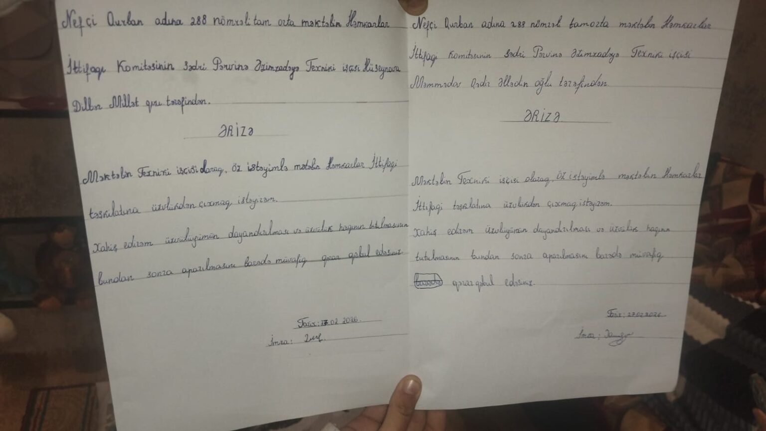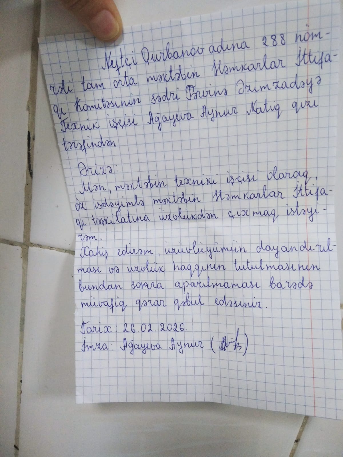 “Azərbaycan Respublikasının qanunvericiliyinə və könüllülük prinsiplərinə əsaslanaraq, biz Həmkarlar İttifaqı üzvlüyündən imtina etmək barədə ərizə ilə müraciət etmişik. Lakin bu təbii hüququmuz məktəb rəhbərliyi tərəfindən bizə qarşı bir repressiya alətinə çevrilib.Məktəbin direktoru Aygün Hüseynova və təsərrüfat işləri üzrə direktor müavini Əliqulu Məmmədov bizi tək-tək otaqlara çağıraraq, ərizələrimizi geri götürməyimiz üçün psixoloji təzyiq göstərir, bizi hədələyirlər.Bu qanunsuzluqların ən pik nöqtəsi isə analıq məzuniyyətinə hazırlaşan həmkarımız Hüseynova Aynura qarşı edilən rəzalətdir. Direktor müavini Əliqulu Məmmədov gənc bir ana namizədini açıq şəkildə şantaj edərək bildirib ki, əgər Həmkarlar İttifaqından çıxsa, ona dövlət tərəfindən verilməli olan analıq məzuniyyəti pulu ödənilməyəcək. Biz soruşuruq: Dövlətin büdcəsini, ananın və körpənin ruzisini kəsmək hədəsi ilə insanları öz maraqlarınıza tabe etmək hansı idarəçilik etikasına sığır?