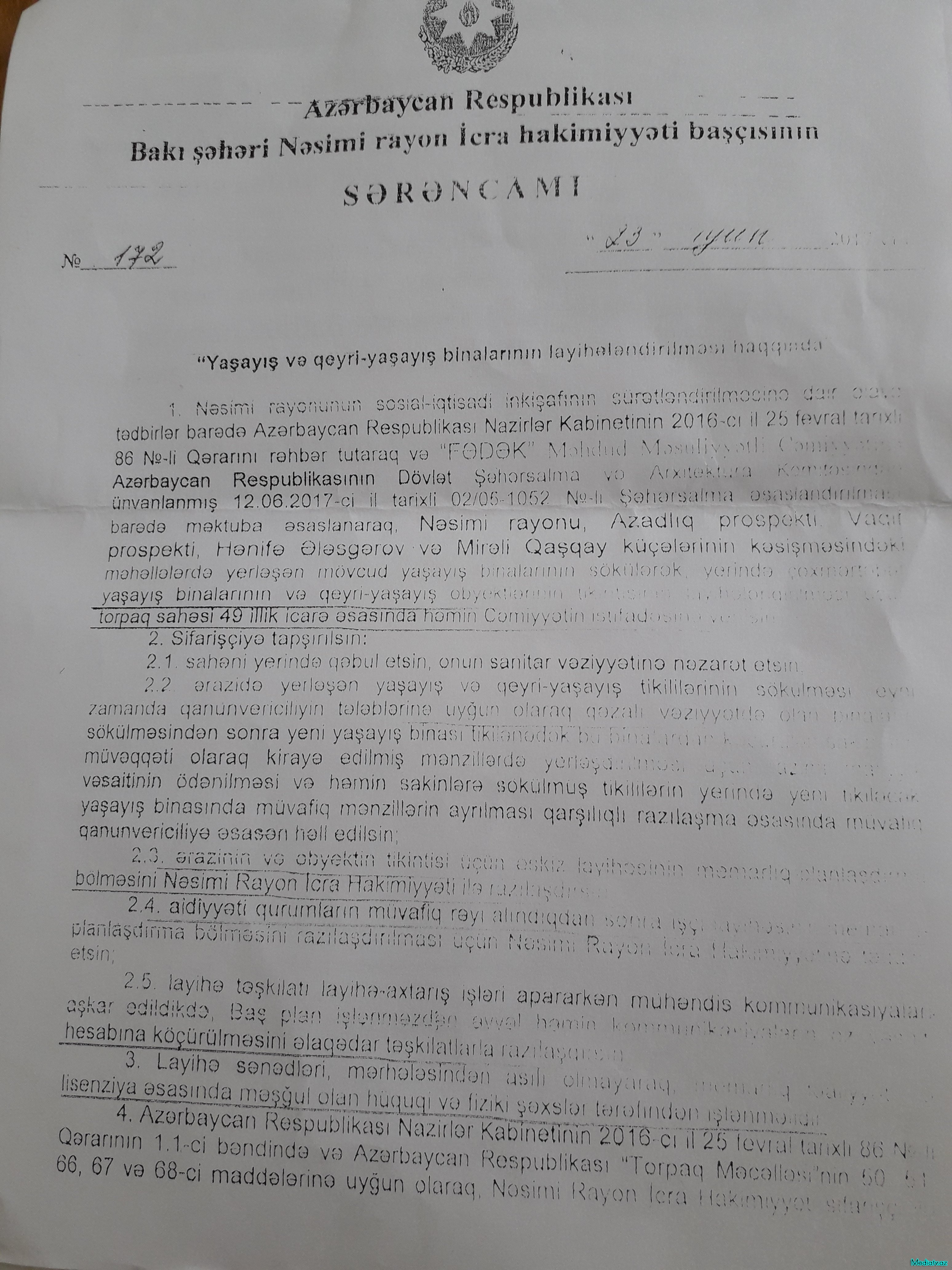 İndi isə digər diversiya haqqında. Əhalinin rəyini hər zaman nəzərə alan Mockva şəhərinin meri Serqey Sobyanindən fərqli olaraq Nəsimi rayon İcra Hakimiyyətinin rəhbərliyi 11 bloklu (bu 100 ailə deməkdir) bina sakinlərinin şəxsi mülkiyyət hüquqlarını və bütün yaşayış massivi vətəndaşlarının maraqlarını tapdalayaraq evi - qəflətən ona bitişik bütün ərazi ilə birlikdə 49 il (!) müddətinə hansısa bir “FƏDƏK” Firmasına icarəyə vermək qərarına gəlmişlər. Bu qərar Nəsimi rayon İcra Hakimiyyətinin Başçısı Asif Əsgərovun verdiyi 23 iyun 2017-ci il tarixli Sərəncamı ilə rəsmiləşdirilmişdir. Sərəncamda, yeganə əsas olaraq, 12.06.2017-ci il tarixdə Şəhərsalma və Arxitektura Komitəsinə göndərdikləri məktuba istinad olunur. Halbuki, Şəhərsalma və Arxitektura Komitəsinin mülkiyyət hüquqlarının müəyyən edilməsinə dair heç bir səlahiyyəti yoxdur. Çünki ərazi baxımından bina bələdiyyənin ixtiyarındadır, torpaq isə ev sahiblərinin şəxsi mülkiyyətidir.