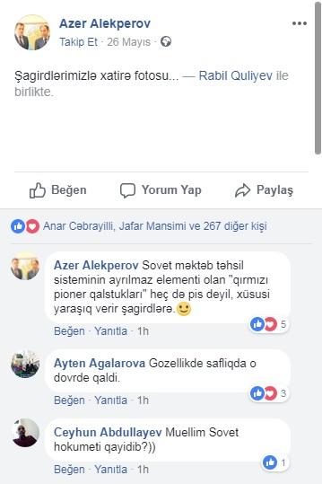 Bütün bunları onun qırmızı pioner qalstuklu şagirdlərinin şəkillərini paylaşmasında, həmçinin, bunun gözəl nümunə olduğunu deməsində də görmək olar.