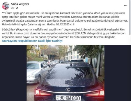“Ölüm qaşla göz arasındadır. Bir anlıq köhnə karamel fabrikinin yanında, dörd yolun kəsişməsində qarşı tərəfdən gələn maşın məni vurdu və yerə yıxıldım. Maşında oturan adam isə rahat şəkildə əyləşmişdi. Ayağa qalxdıqdan sonra yaxınlaşdı. Hazırda sol qolum və sol ayağımda dəhşətli ağrılar var. Hələ də isti-isti qabırğalarım ağrıyır. Hadisə 05.12.2025 ci il