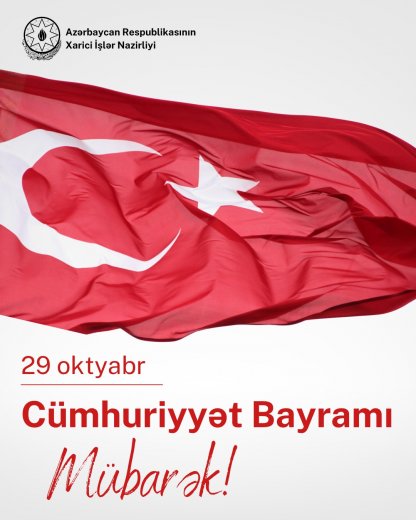 “29 Oktyabr - Türkiyə Respublikasının əsasının qoyulmasının 102-ci ildönümü münasibətilə qardaş Türkiyə xalqını və dövlətini səmimi-qəlbdən təbrik edirik.Bu tarixi gündə, Türkiyə Respublikasının banisi, dahi Mustafa Kamal Atatürkü, eləcə də Cümhuriyyətin yaradılması uğrunda canlarını fəda etmiş şəhidlərimizi və qazilərimizi dərin ehtiramla yad edirik.
