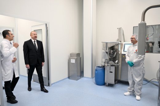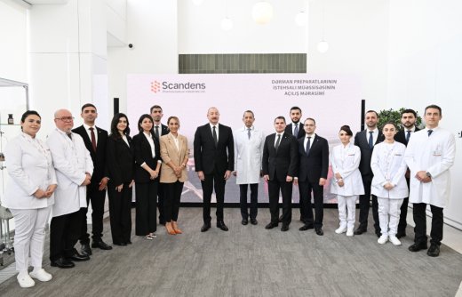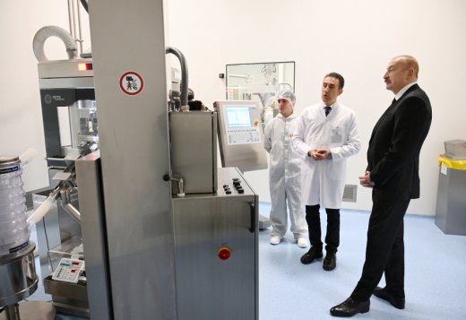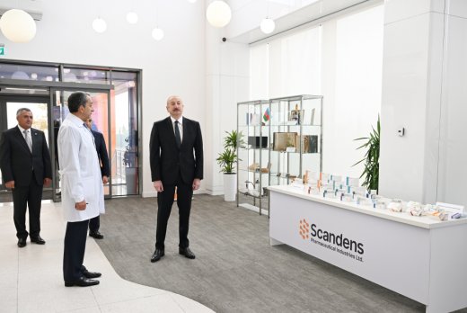 Azərbaycan Prezidenti İlham Əliyev Abşeron rayonunun Hökməli qəsəbəsində “Scandens Pharmaceutical Industries Ltd” MMC-nin dərman preparatları istehsalı müəssisəsinin açılışında iştirak edib.Mediatv.az xəbər verir ki, iqtisadiyyat naziri Mikayıl Cabbarov və baş direktor Kamran Həsənov dövlət başçısına müəssisə barədə məlumat veriblər.