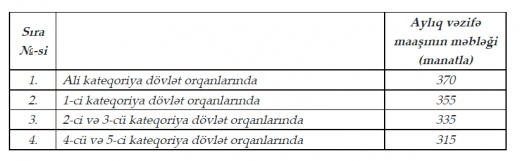 Qərara əsasən, dövlət orqanlarında çalışan dövlət qulluqçusu olmayan işçilərin (qeydiyyatçı, nəzarətçi, təsərrüfat işçisi, xadimə, dalandar, bağban, gözətçi, ocaqçı, ixtisas dərəcəsi olmayan fəhlə və s.) aylıq vəzifə maaşları artırılıb.