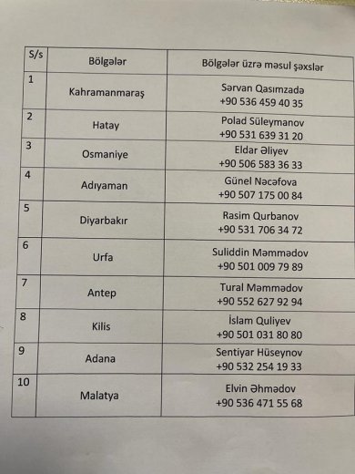 Səfirlik həmçinin bölgələr üzrə məsul şəxslərin ad və telefon nömrələrini açıqlayıb. Həmin nömrələri təqdim edirik: