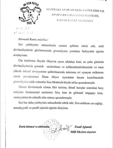 "Hörmətli, Ramiz müəllim, sizi yubileyiniz münasibətilə səmimi qəlbdən təbrik edir, milli dövlətçiliyimizin güclənməsində göstərdiyiniz yorulmaz fəaliyyətdə uğurlar arzulayıram.