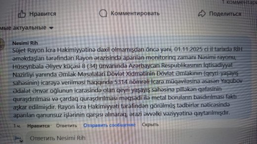 Belə ki, Nəsimi rayon icra Hakimiyyətinin rəsmi məlumatında qeyd olunur ki, 01.11.2025 ci il tarixdə RİH əməkdaşları tərəfindən Rayon ərazisində aparılan monitorinq zamanı Nəsimi rayonu, Hüseynbala Əliyev küçəsi 8 (34) ünvanında Azərbaycan Respublikasının İqtisadiyyat Nazirliyi yanında Əmlak Məsələləri Dövlət Xidmətinin Dövlət Əmlakının (qeyri-yaşayış sahəsinin) icarəyə verilməsi haqqında 5314 nömrəli İcarə müqaviləsinə əsasən Yaqubov Ədalət Ənvər oğlunun icarəsində olan qeyri yaşayış sahəsinə pilləkən qəfəsinin quraşdırılması və çardaq quraşdırılması məqsədi ilə metal boruların basdırılması faktı aşkar edilmişdir. Rayon İcra Hakimiyyəti tərəfindən görülmüş tədbirlər nəticəsində aparılan qanunsuz işlərinin qarşısı alınaraq, ərazi əvvəlki vəziyyətinə qaytarılmışdır.