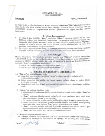 Müqaviləyə əsasən, “Max Group” MMC Aysutümay Koyuna İzmir Demokrasi Universitetinin “Fizyoterapi və Rehabilitasyon” ixtisası üzrə bakalavriat təhsil pilləsinə sənədləşmə işinin aparılması xidmətini göstərməlidir.