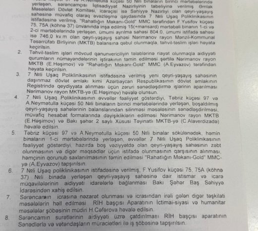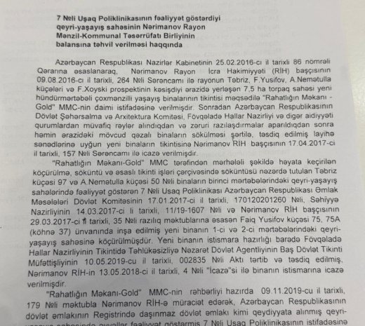 Nərimanov rayonunda dövlət əmlakının, konkret desək, 7 nömrəli Uşaq Poliklinikasının illərlə fəaliyyət göstərdiyi binanın taleyi ətrafında maraqlı sənədlər üzə çıxıb. Bu sənədlərdən aydın olur ki, dövlət tibb müəssisəsinin fəaliyyəti üçün nəzərdə tutulan ərazi sonradan tikinti şirkətinin nəzarətinə keçib, amma formal olaraq başqa bir qurumun balansına verilib. Hər şey 2016-cı ilin avqustunda Nərimanov Rayon İcra Hakimiyyətinin (RİH) 264 nömrəli sərəncamı ilə başlayır. Həmin sərəncamla Təbriz, Ağa Nemətulla və Fətəli Xan Xoyski prospektlərinin kəsişdiyi 7,5 hektarlıq torpaq sahəsi “Rahatlığın Məkanı – Cold” MMC-yə ayrılır. Şirkət burada çoxmərtəbəli binalar inşa etmək üçün torpaq alır. Ərazidə 9 bloklu, 16 mərtəbəli bina tikilir. Lakin yeni kompleksin yalnız bir parkinq giriş-çıxışı var. Bu, ətrafdakı köhnə beşmərtəbəli binaların da giriş-çıxış imkanlarını məhdudlaşdırıb. Üstəlik, 16 mərtəbəli yaşayış binasının həyətinə girişdə şlaqbaum qoyulub. Nəticədə 7 nömrəli Uşaq Poliklinikasına gələn xəstələr, o cümlədən əlillər avtomobillə həyətə buraxılmır. Onları içəriyə ancaq qucaqda daşımaq mümkündür. Yanğın təhülükəsizliyindən danışmaq isə ümumiyyətlə yersizdir. Vaxtilə həmin sahədə 7 nömrəli Uşaq Poliklinikası fəaliyyət göstərirdi və vətəndaşlar heç bir maneə olmadan poliklinikaya gedə bilirdilər. Tikinti işləri başlayanda bina sökülüb və 2017-ci ildə RİH-in 157 nömrəli sərəncamı ilə müvəqqəti olaraq F.Yusifov küçəsi 75, 75A (köhnə 37) ünvanındakı binaya köçürülüb.804 kvadrat metrlik “qeyri-yaşayış” sahəsi kimindir?