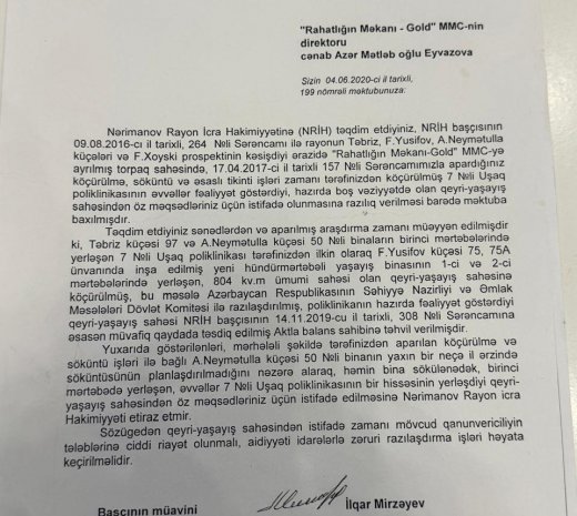 2019-cu ilin noyabrında Nərimanov RİH başçısının №308 saylı sərəncamına əsasən, uşaq poliklinikasının əvvəlki yerində “Rahatlığın Məkanı – Cold” MMC tərəfindən inşa olunmuş binada 804 kv.m ümumi, 746 kv.m istifadə sahəsi olan qeyri-yaşayış obyekti ayrılır. Sənəddə qeyd olunur ki, bu obyekt Nərimanov Rayon Mənzil-Kommunal Təsərrüfat Birliyinin (MKTB) balansına qəbul edilir. Formal olaraq dövlət qurumunun balansında olsa da, faktiki olaraq həmin sahə tikintini həyata keçirən MMC-nin rəhbəri Mahir Mətləb oğlu Eyvazovun nəzarətindədir. Tikilidəki mənzillərin çoxunun ƏDV-si və satış sənədləri Mahir Eyvazovun yaxınlarının adına rəsmiləşdirilib. 2020-ci ilin iyununda RİH aparat rəhbəri İlqar Mirzəyev “Rahatlığın Məkanı - Cold” MMC-nin direktoru Azər Eyvazova rəsmi məktub göndərərək xəbərdarlıq edir ki, obyekt MKTB-nin balansındadır və şirkətin bu ərazidən istifadəsi yalnız qanunvericiliyə uyğun şəkildə mümkündür. Başqa sözlə, icra hakimiyyəti dövlət əmlakından icazəsiz istifadəni “yolverilməz” sayır.