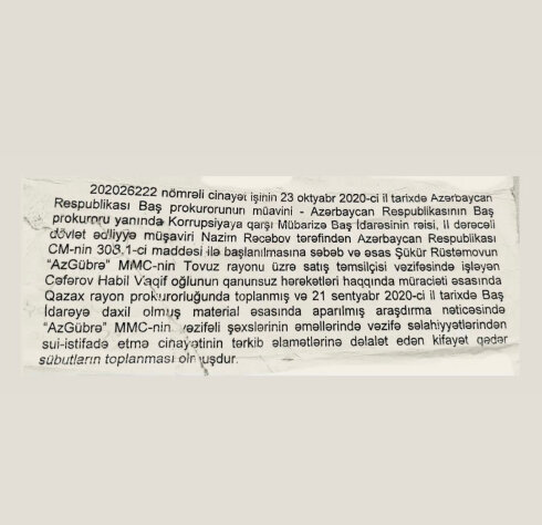 O, "AzGübrə" MMC-nin Tovuz rayonu üzrə satış müdiri Habil Cəfərovun və Ağstafa rayon Aqrolizinq idarəsinin rəhbər vəzifəli şəxsi Cavanşir Əmrahovun adını çəkərək, onların öz vəzifə səlahiyyətlərindən sui-istifadə etdiklərini bildirir.