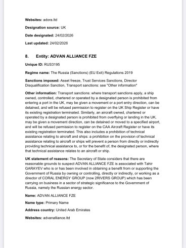 Dubayda yerləşən Foxton FZCO (Rusiya ixrac sənədlərində 5,6 milyard dollarlıq neft alıcısı kimi göstərilib) və Hindistan sənədlərində 1,5 milyard dollarlıq Rusiya neftinin satıcısı kimi göstərilən Advan Alliance da sanksiya siyahısına daxil edilib.