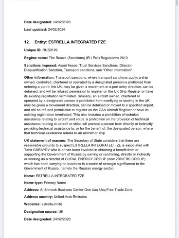 Böyük Britaniya mühüm neft gəlirlərini kəsən və Kremlin qanunsuz müharibə aparmaq qabiliyyətini daha da zəiflədən mühüm sanksiyalar paketini elan edib.Böyük Britaniya, əvvəlcə Coral Energy kimi qurulan BƏƏ-də yerləşən 2Rivers şirkəti ilə əlaqəli kölgə donanması şirkətlərinin bütün şəbəkəsini sanksiyalaşdırıb.
