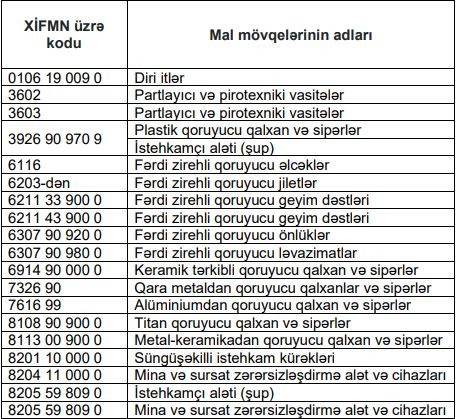 Həmin malların siyahısı aşağıdakı kimidir: