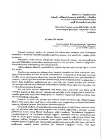 Sakinlər iddia edirlər ki, sözügedən yaşayış kompleksinin qarajında 01.01.2022-ci il tarixindən standart parkinq yerləri üçün aylıq ödənişlərin 75 manatdan başlayacağı qeyd edilən elan vurulub: