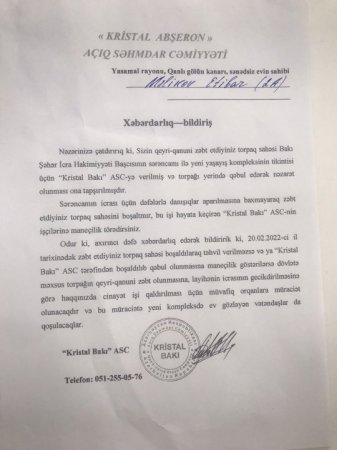 Mən inanıram ki, heç bir dövlət qurumu nə adi bir vətəndaşın, nə də bir Qarabağ müharibəsi iştirakçısını, daxili işlər orqanlarının veteranının razılığı olmadan ağaclarını kəsməyə, mənzilini uçurmağa, özünü çölə atmağa göstəriş verməyib. Mən buna əminəm. Dövlət hər zaman çətin gündə vətəndaşın yanında olub və Qarabağ müharibəsi veteranları isə xüsusi qayğı ilə əhatə olunub. Bunu şirkət rəhbərliyi də yaxşı bilir. Lakin nədənsə “Kristal Abşeron” şirkətinin törətdiyi əməllər hələlik müvafiq dövlət qurumlarının nəzarətindən kənarda qalıb.