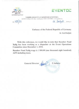Sözgedən Komitənin Baş direktoru Elçin Səfərovun imzası (mümkündür ki, direktorun imzası da saxtalaşdırılıb) olan bu sənəd Avropaya can atan Rəcəbov Fuad Xaliq oğluna 6 sentiyabr 2019-cu ildə (488/09 saylı) verilib. Baş direktorun imzasını ona görə ehtimalla yazdıq ki, hazırda şərikləri tərəfindən həbsə atılmış Tural Heydərli adlı sahibkarın prezident də daxil, müxtəlif dövlət qurumlarına yazdığı ərizədən belə anlaşılır ki, bu saxta arayışın əsas təşkilatçısı qanunla qadağan olunsa da həm də sahibkarlıq fəaliyyətiylə məşğul olan "EVENTOC”un Maliyyə direktoru ("buqalter”) Elmar Əliyevdir.