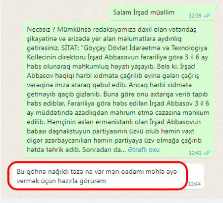 Yazılan ittihamlarla əlaqədar İrşad Abbasovla əlaqə yaratdıq. Vatsap-a cavabında İrşad Abbasov görün nə yazdı: "Bu göhnə nağıldı təzə nə var mən oadamı məhlə əyə vermək üçün hazırla görürəm".
