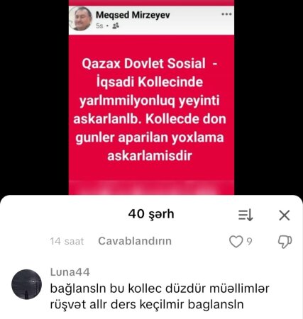 Luna44: “Bağlansın bu kollec. Düzdür, müəllimlər rüşvət alır, dərs keçilmir. Bağlansın.”